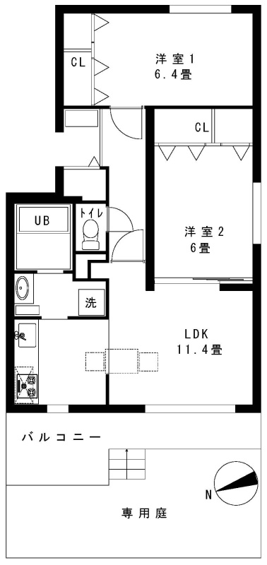 2LDK(56.86m²)└ 1階:LDK11.4帖 洋室6.4帖 洋室6帖