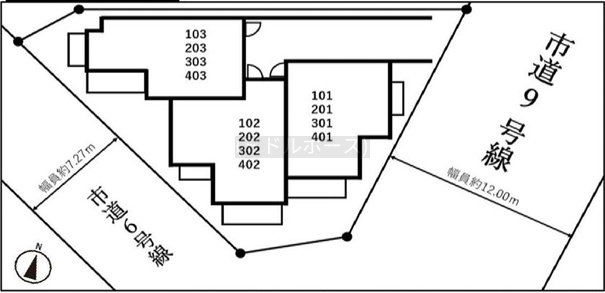 建物の階建 地上4階建 間取り 2DK×12戸 駐車場 接道状況 - 東側幅12.00mの公道に接道