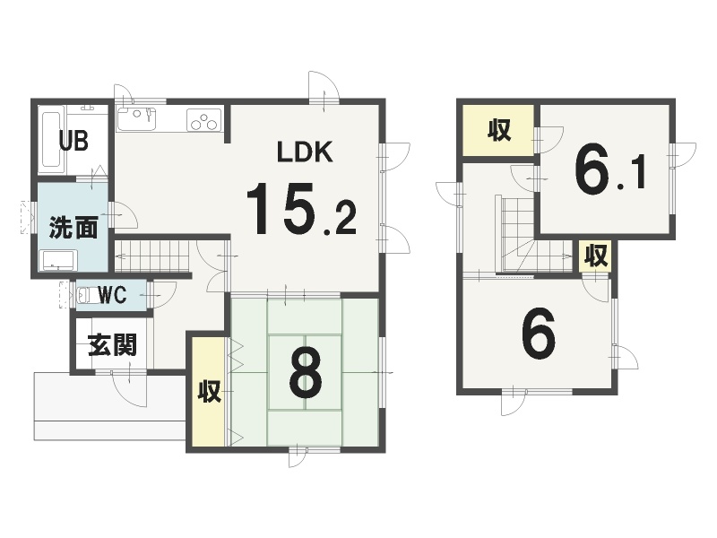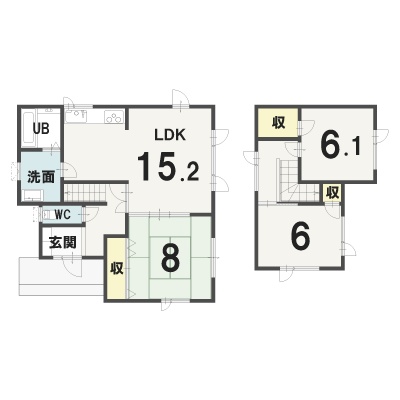 | 間取り | 3LDK1階:LDK15.2帖 和室8帖 / 2階:洋室6.1帖 洋室6帖 |