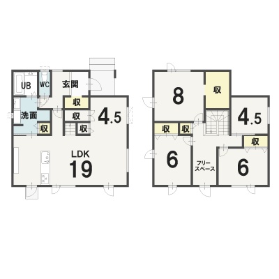 | 間取り | 5LDK1階:LDK19帖 洋室4.5帖 / 2階:洋室6帖 洋室6帖 洋室4.5帖 洋室8帖 |