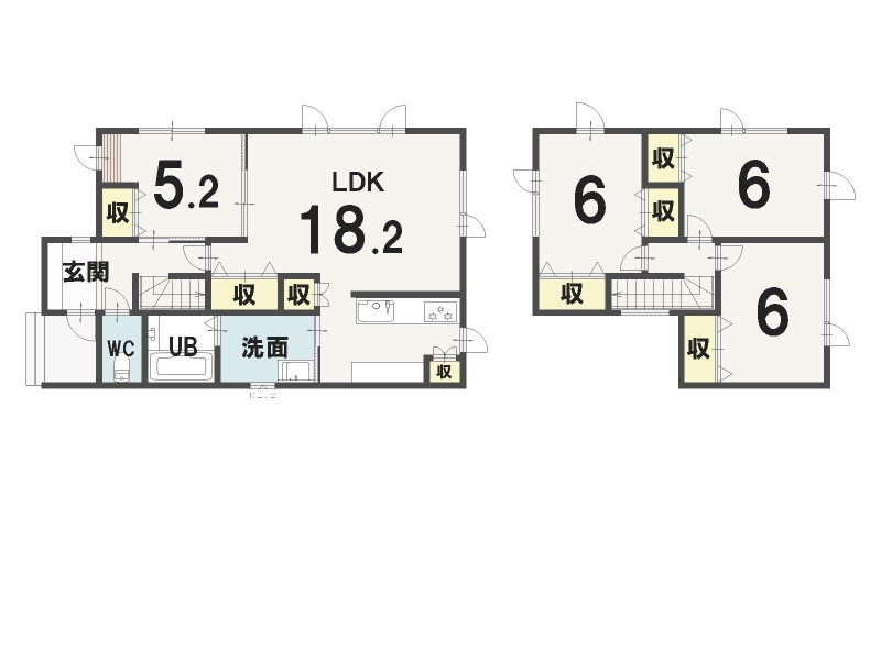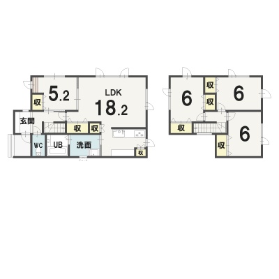 | 間取り | 4LDK1階:LDK18.2帖 洋室5.2帖 / 2階:洋室6帖 洋室6帖 洋室6帖 |