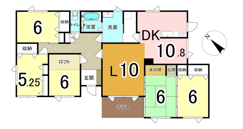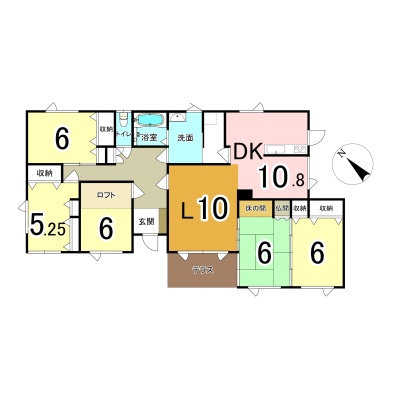 | 間取り | 5LDK1階:L10帖 DK10.8帖 洋室6帖 洋室6帖 洋室5.2帖 洋室6帖 和室6帖 |