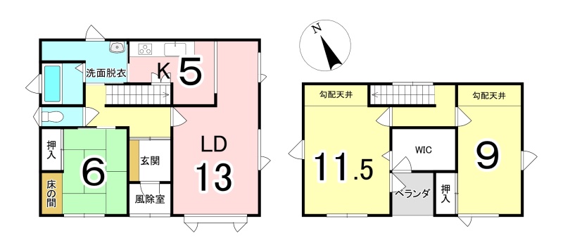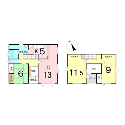 | 間取り | 3LDK1階:LD13帖 K5帖 和室6帖 / 2階:洋室11.5帖 洋室9帖 |