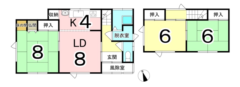 | 間取り | 3LDK1階:LD8帖 K4帖 和室8帖 / 2階:洋室6帖 和室6帖 |