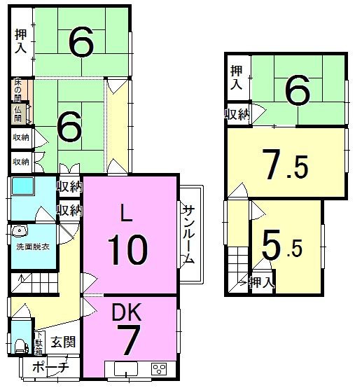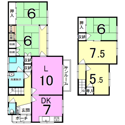 | 間取り | 5LDK1階:L10帖 DK7帖 和室6帖 和室6帖 / 2階:和室6帖 洋室7.5帖 洋室5.5帖 |