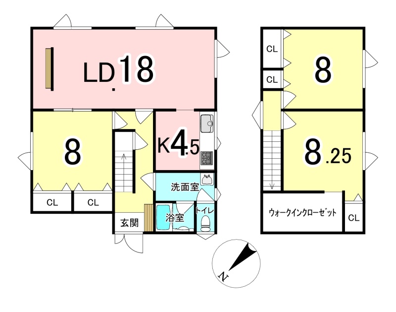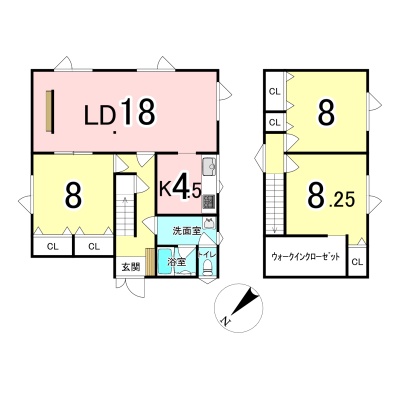 | 間取り | 3LDK1階:LD18帖 K4.5帖 洋室8帖 / 2階:洋室8帖 洋室8.2帖 |