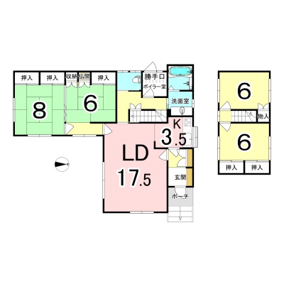 | 間取り | 4LDK1階:LD17.5帖 K3.5帖 和室8帖 和室6帖 / 2階:洋室6帖 洋室6帖 |