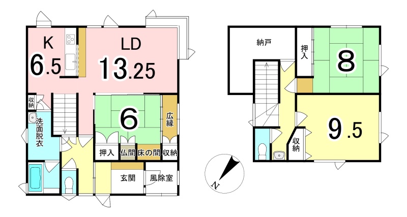 | 間取り | 3LDK1階:LD13.2帖 K6.5帖 和室6帖 / 2階:和室8帖 洋室9.5帖 |