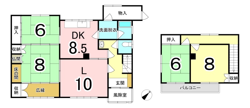 | 間取り | 4LDK1階:L10帖 DK8.5帖 和室8帖 和室6帖 / 2階:和室6帖 洋室8帖 |