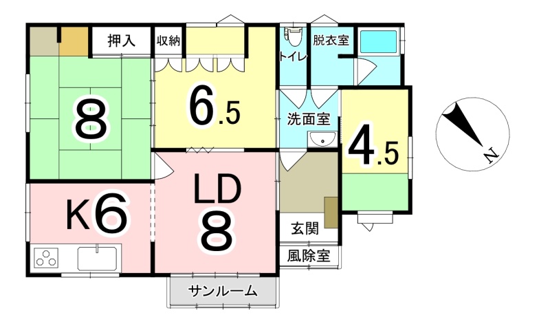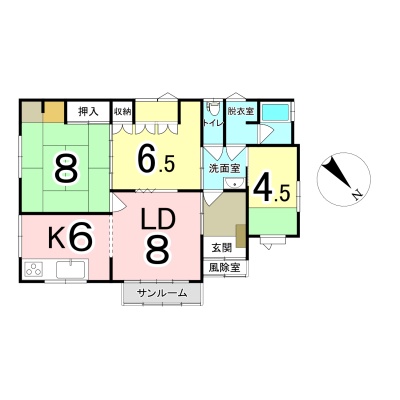 | 間取り | 3LDK1階:LD8帖 K6帖 洋室6.5帖 洋室4.5帖 和室8帖 |