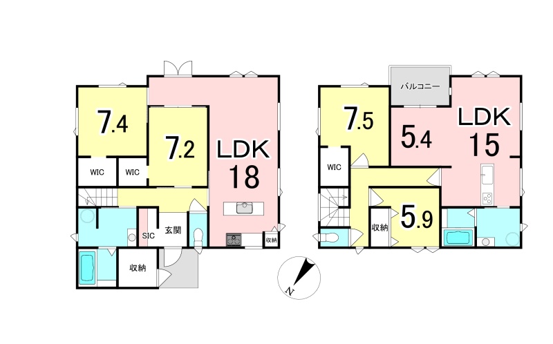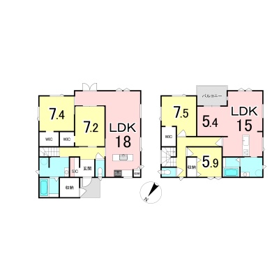 | 間取り | 二世帯型1階:LDK18帖 洋室7.4帖 洋室7.2帖 / 2階:LDK20.4帖 洋室7.5帖 洋室5.9帖 |