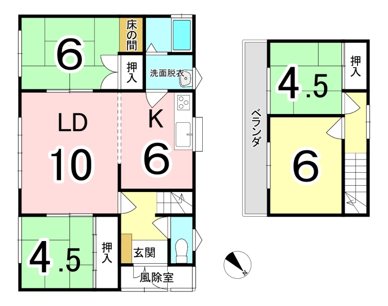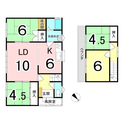 | 間取り | 4LDK1階:LD10帖 K6帖 和室6帖 和室4.5帖 / 2階:洋室6帖 和室4.5帖 |