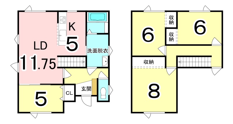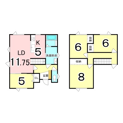 | 間取り | 4LDK1階:LD11.7帖 K5帖 洋室5帖 / 2階:洋室6帖 洋室6帖 洋室8帖 |