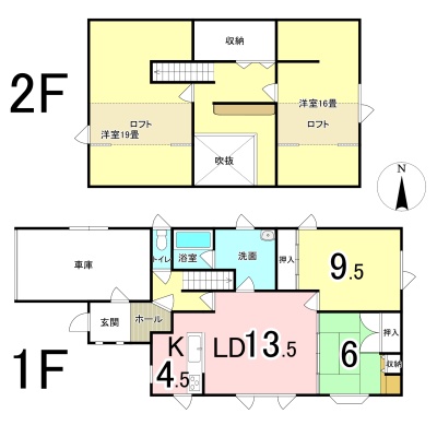 | 間取り | 4LDK1階:LDK18帖 洋室9.5帖 和室6帖 / 2階:洋室19帖 洋室16帖 |
