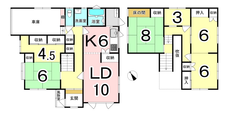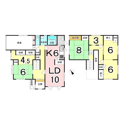 | 間取り | 4LDK1階:LD10帖 K6帖 和室6帖 / 2階:和室8帖 洋室6帖 |