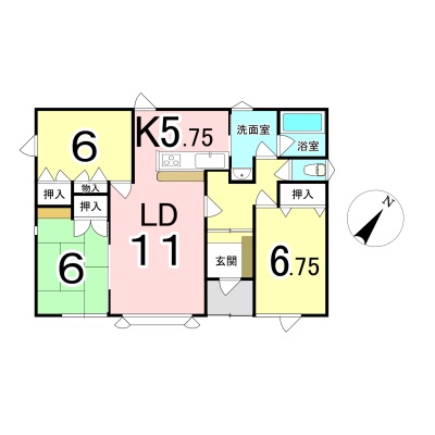 | 間取り | 3LDK1階:LD11帖 K5.75帖 和室6帖 洋室6帖 洋室6.75帖 |