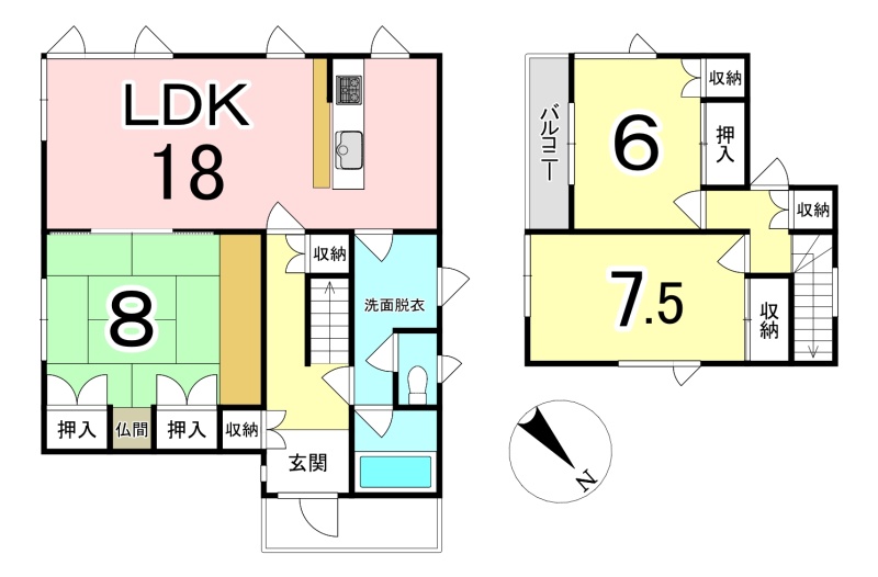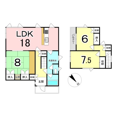 | 間取り | 3LDK1階:LDK18帖 和室8帖 / 2階:洋室6帖 洋室7.5帖 |