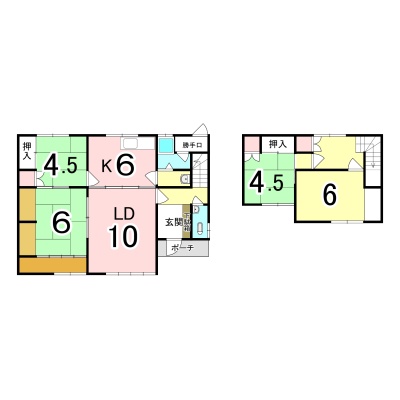 | 間取り | 4LDK1階:L10帖 DK6帖 和室4.5帖 和室6帖 / 2階:和室4.5帖 洋室6帖 |