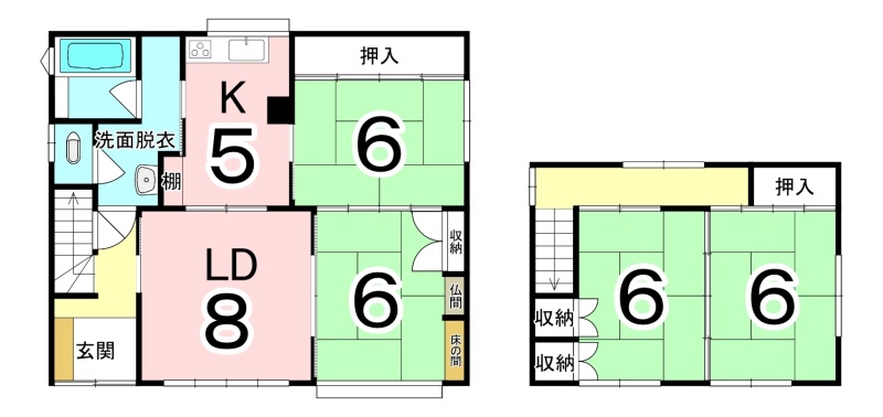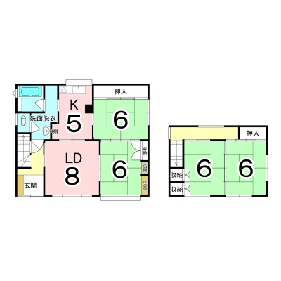 | 間取り | 4LDK1階:LD8帖 K5帖 和室6帖 和室6帖 / 2階:和室6帖 和室6帖 |
