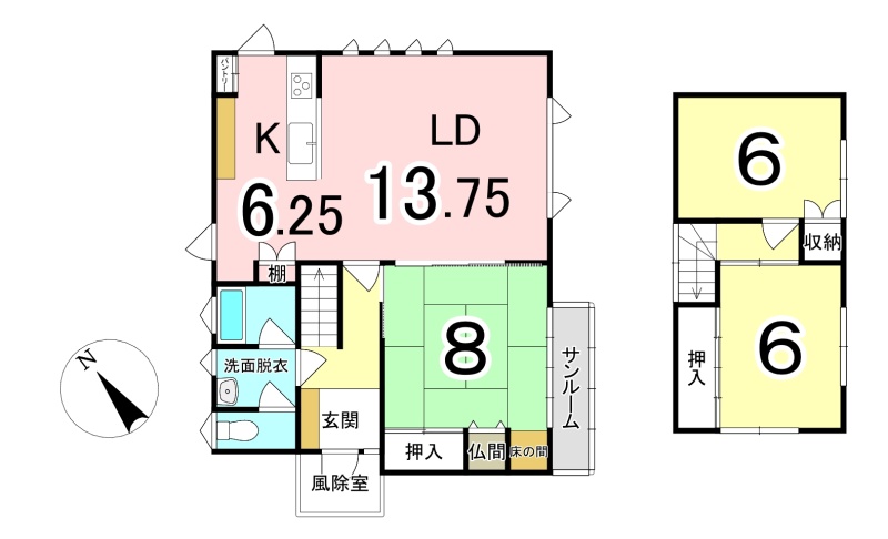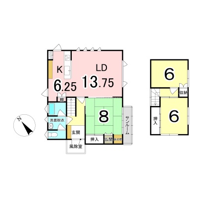 | 間取り | 3LDK1階:K6.2帖 和室8帖 / 2階:洋室6帖 洋室6帖 / その他:LD13.7帖 |