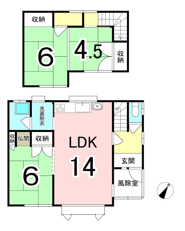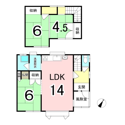 | 間取り | 3LDK1階:LDK14帖 和室6帖 / 2階:和室6帖 和室4.5帖 |