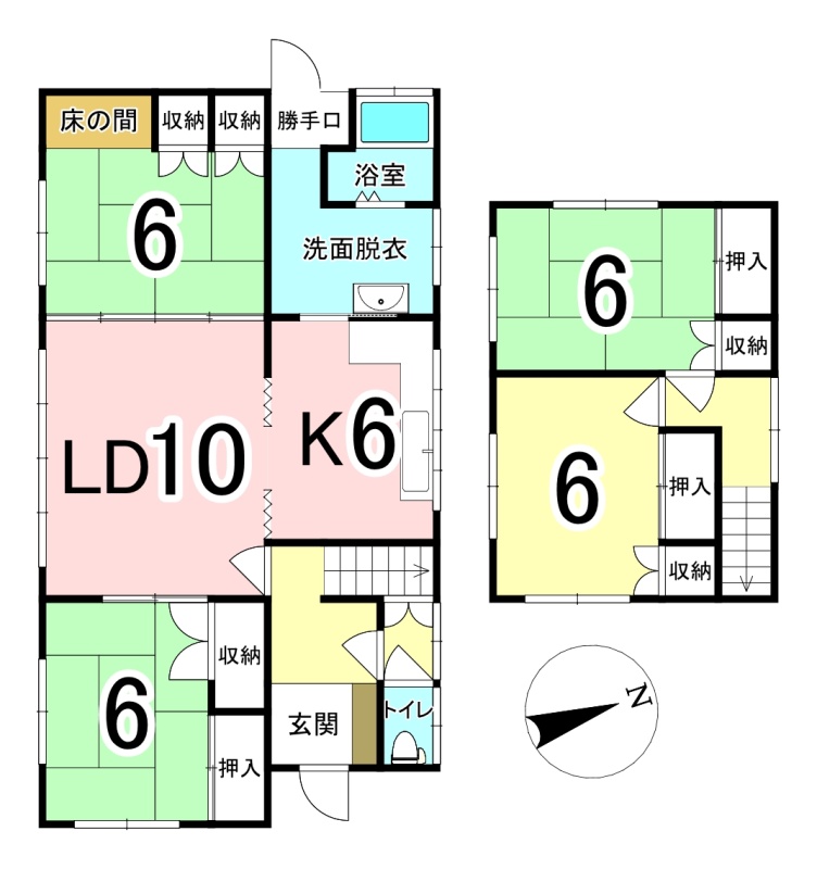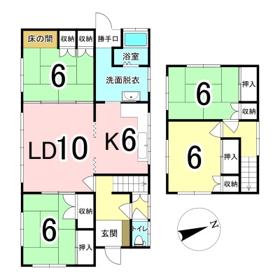 | 間取り | 4LDK1階:LD10帖 K6帖 和室6帖 和室6帖 / 2階:洋室6帖 和室6帖 |