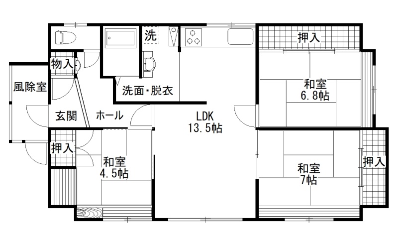 | 間取り | 3LDK1階:LDK13.5帖 和室4.5帖 和室6.8帖 和室7帖 |