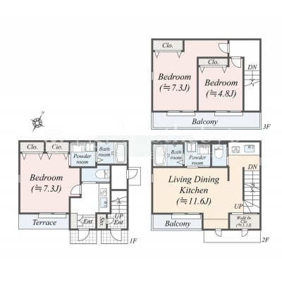 | 面積 | 建物:96.99m² (29.33坪)/ 土地:73.11m² (22.11坪)(公簿)※セットバックが必要(16.09m²) 専有:最小28.08m² (8.49坪)~最大68.91m² (20.84坪) |