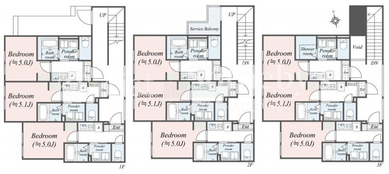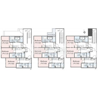 | 面積 | 建物:197.35m² (59.69坪)/ 土地:121.4m² (36.72坪)(公簿)※セットバック済み 専有:最小18.28m² (5.52坪)~最大18.53m² (5.6坪) |