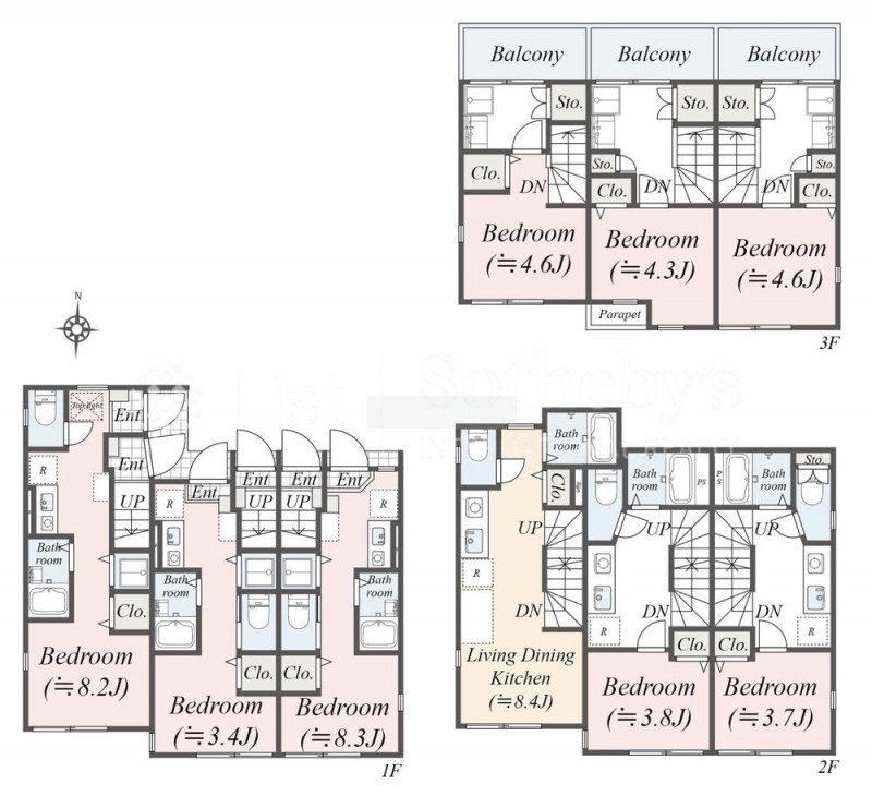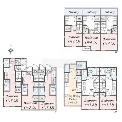 | 面積 | 建物:157.64m² (47.68坪)/ 土地:114.11m² (34.51坪)(公簿) 専有:最小15.6m² (4.71坪)~最大36.61m² (11.07坪) |