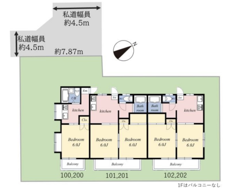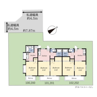 建物の階建 地上2階建 間取り 1K×2戸、2K×4戸 駐車場 あり接道状況 - 北西側幅4.50mの私道に7.87m接道