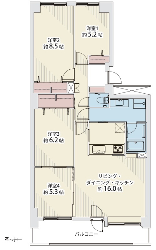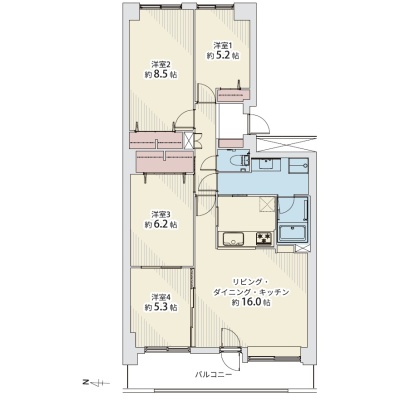 4LDK(91.66m²)└ 6階:LDK16帖 洋室8.5帖 洋室6.2帖 洋室5.3帖 洋室5.2帖